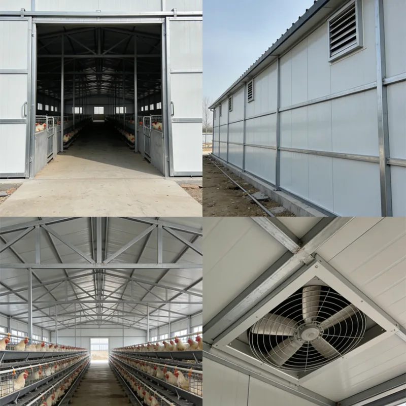 •カスタマイズされた構成:実際のニーズに基づいて、断熱材(安定した温度を維持するため)、換気/温度制御システム、床材の種類、囲い区画、肥料排出路、給餌通路、防疫用ドア/窓をカスタマイズします。